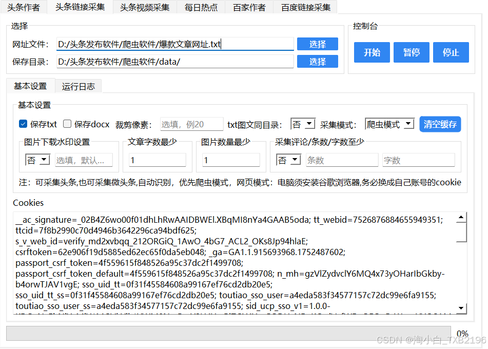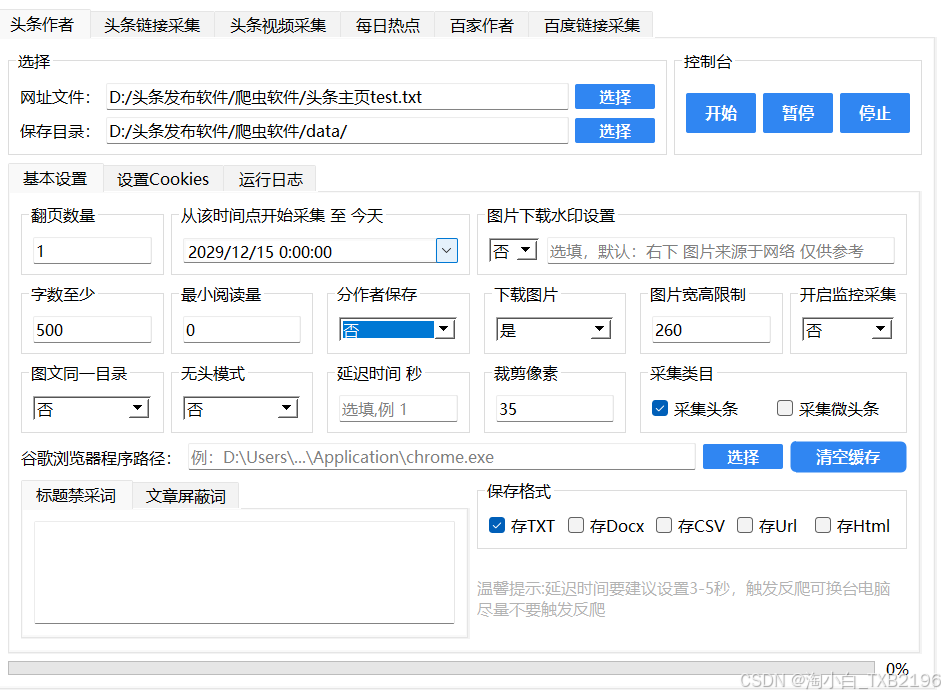 1、网址路径:txt的路径,我们需要把头条作者主页的网址(电脑端的)放到txt中去,点击"选择",选中这个文件。