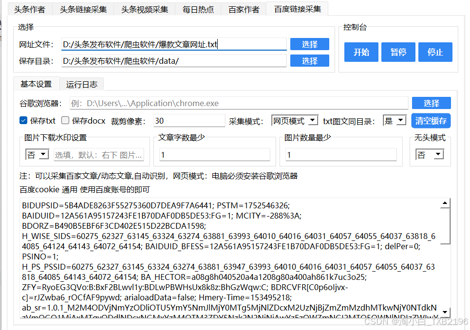 百度按照链接采集,和头条按照链接采集一样,从大数据平台下载爆文网址,导入到软件中,然后下载到本地,这里只推荐使用网页模式采集,设置项和按照作者采集的设置项一致。