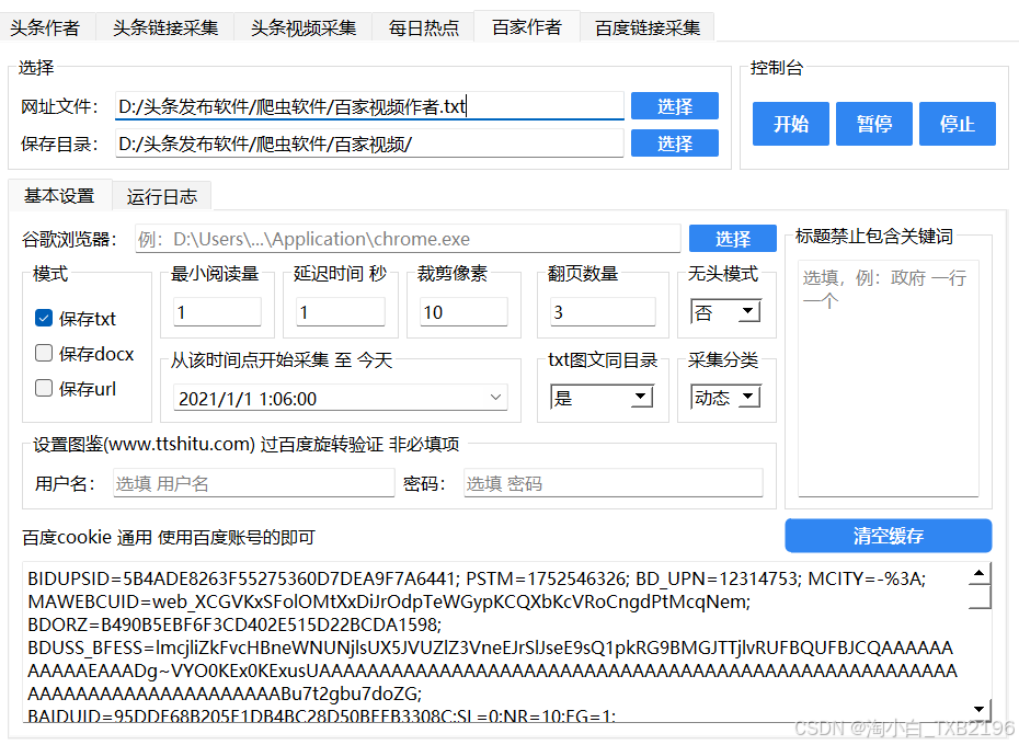4、时间限制:从这个时间点开始采集,这个时间点之后,作者发布的文章采集下来,这个时间点之前的文章不采集。