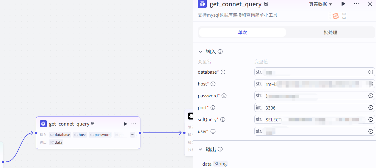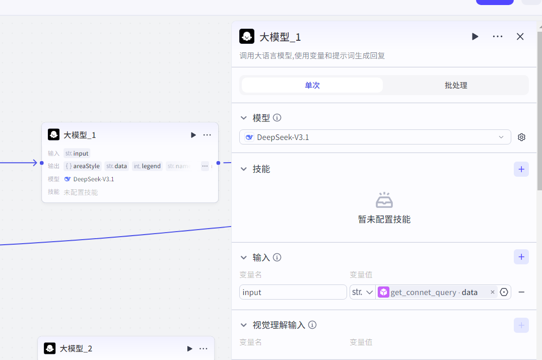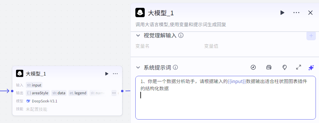 这里使用大模型的目的,是为了将mysql查询出来的数据转为纯净的结构化数据进行输出,从而给后续数据报表插件节点使用时无需继续转换,如下,添加一个大模型节点,输入参数为上一个节点的数据库查询的数据