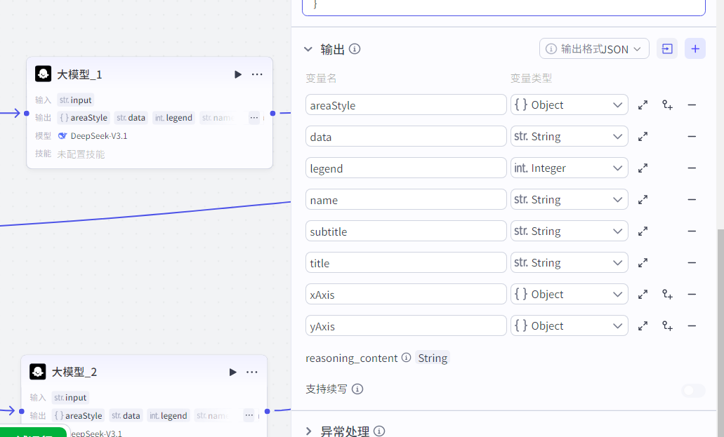 大模型最终需要输出一些参数,这些参数作为数据报表展示的时候需要的各个参数,比如echarts柱状图,热力图等