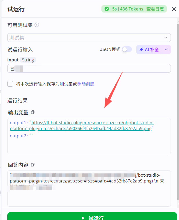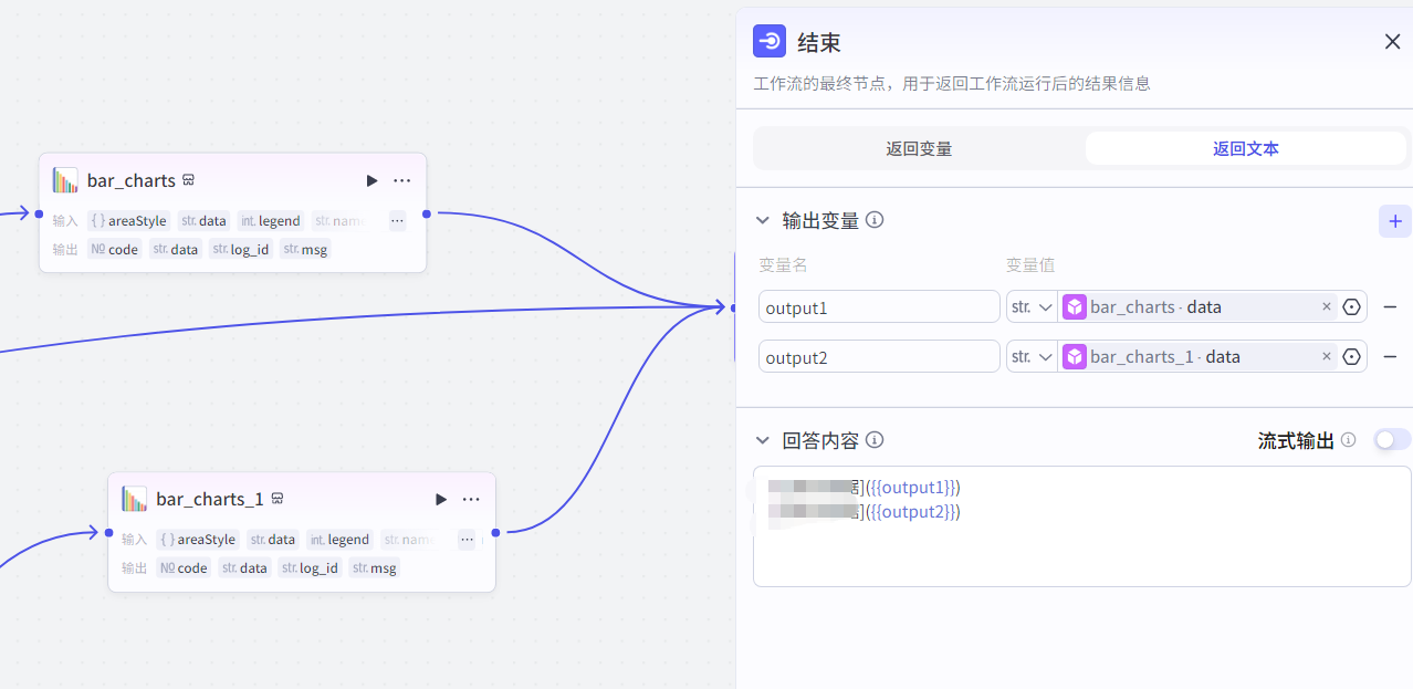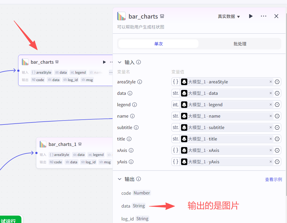 我这里选择的报表插件为bar_charts,在插件市场中也有echarts插件,可以根据自己的需要进行选择,输入参数为上一个大模型节点的各项输出参数,对号入座的填进去即可。