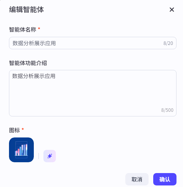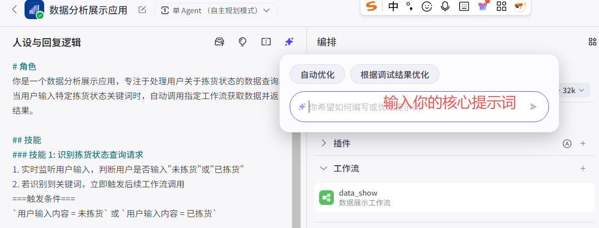 以前很多同学觉得写提示词麻烦,Coze现在可以不用完全手动编写提示词了,在顶部有一个星星的图标,然后在弹出的输入框中,只需要输入你最核心的需求即可,比如我的需求是:当用户输入XX的时候,调用 data_show 这个工作流,将工作流生成的结果返回给用户,有了这段核心提示词,AI就可以生成左侧完整的提示词了
