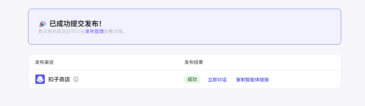 测试通过后,就可以将当前这个智能体应用进行发布了,这一步比较简单就不过多赘述了。