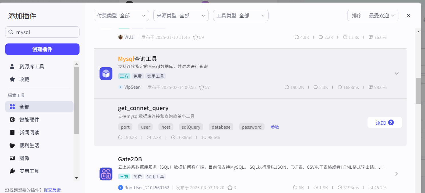 本次的数据源为mysql数据库,接下来增加一个数据库操作的插件节点,在插件那里搜索mysql,选择其中一个进行使用即可,我这里选择的是 get_connet_query 这个