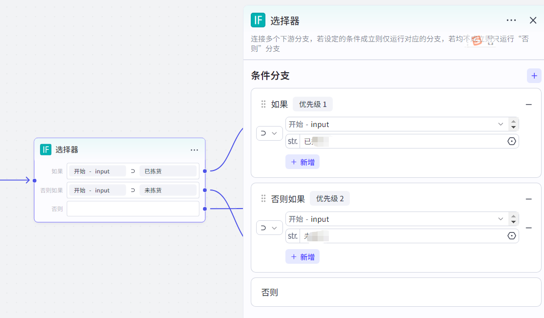 我这里的场景是根据用户输入的不同关键词走后面不同的分支,不同的分支得到的数据不一样,如下,增加一个选择器节点,条件分支中根据自己的实际要求进行配置