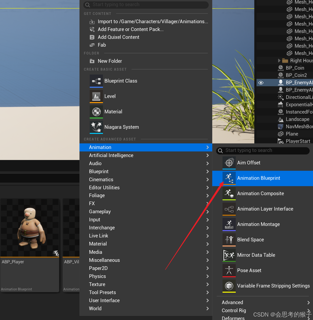 角色要播放动画,必须先创建一个动画蓝图,我这里创建起名 ABP_Player