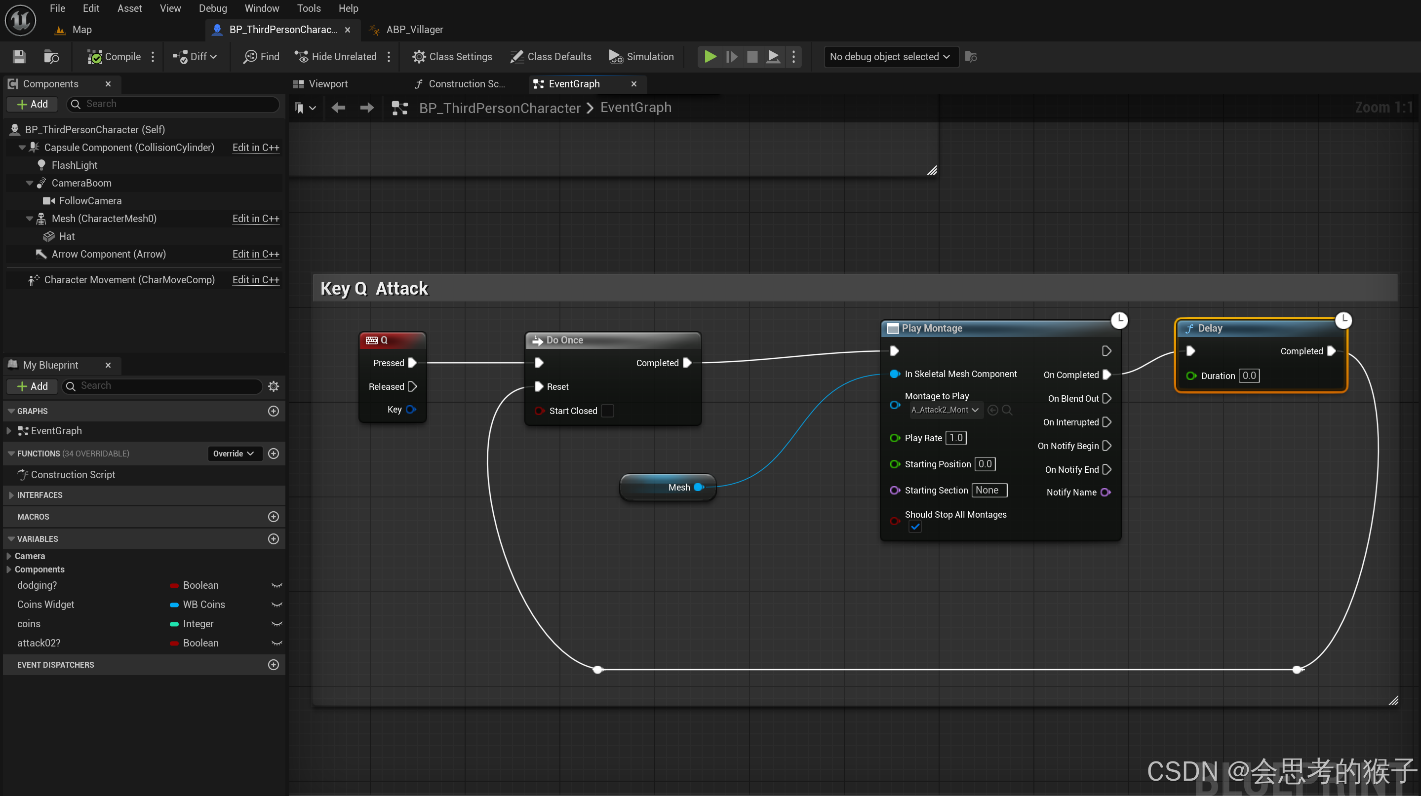 5. 在蓝图中,如图连接即可, 加这个 DoOnce 节点是因为 我希望它这个动画只有播放完成,才能重新接收 Q 键事件,播放攻击动画