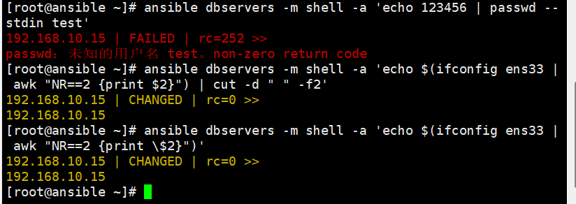 ansible dbservers -m shell -a 'echo $(ifconfig ens33 | awk "NR==2 {print \$2}")'