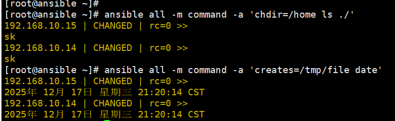 ansible all -m command -a 'removes=/tmp/file date' # 文件存在则执行