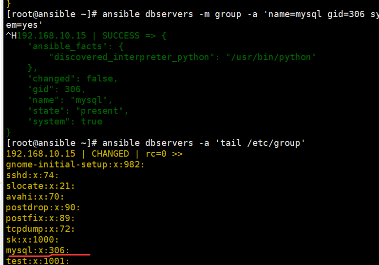 ansible dbservers -m group -a 'name=mysql gid=306 system=yes'