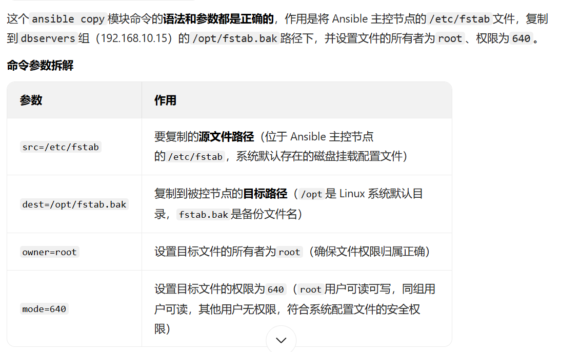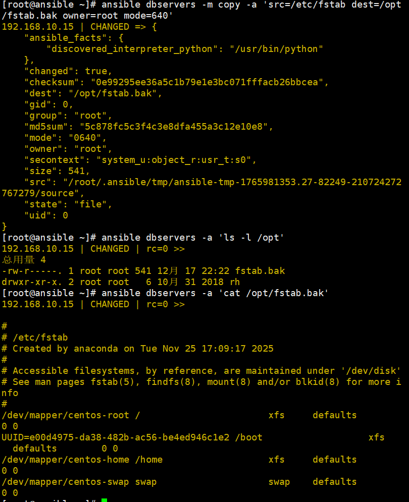 ansible dbservers -m copy -a 'src=/etc/fstab dest=/opt/fstab.bak owner=root mode=640'