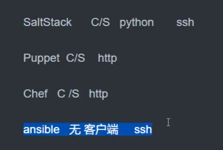 面向类Unix系统的自由开源配置和自动化工具,采用Python语言编写。与其他自动化工具如SaltStack(Python C/S)、Puppet(ruby C/S)、Chef相比,Ansible具有以下显著优势: