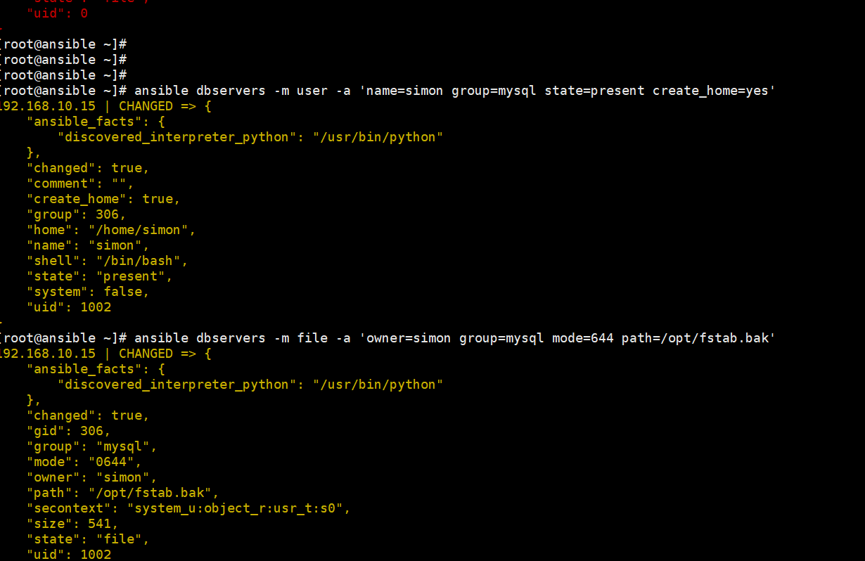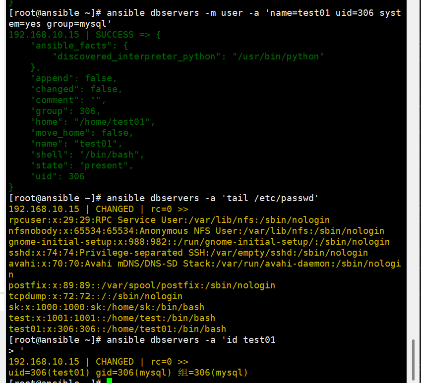 ansible dbservers -m user -a 'name=test01 uid=306 system=yes group=mysql'
