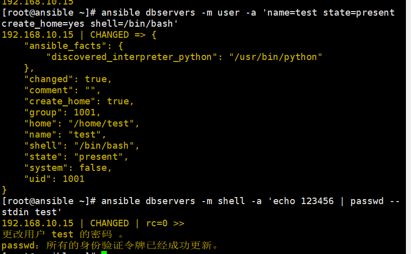 ansible dbservers -m shell -a 'echo 123456 | passwd --stdin test'