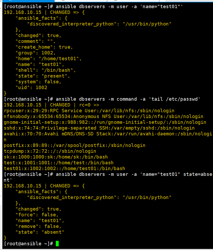ansible dbservers -m user -a 'name="test01" state=absent'