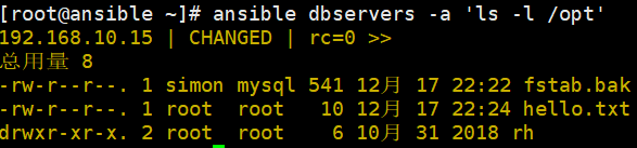 ansible dbservers -m file -a 'owner=simon group=mysql mode=644 path=/opt/fstab.bak'