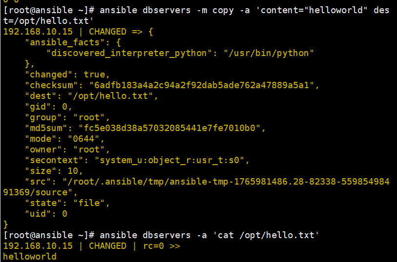 ansible dbservers -m copy -a 'content="helloworld" dest=/opt/hello.txt'