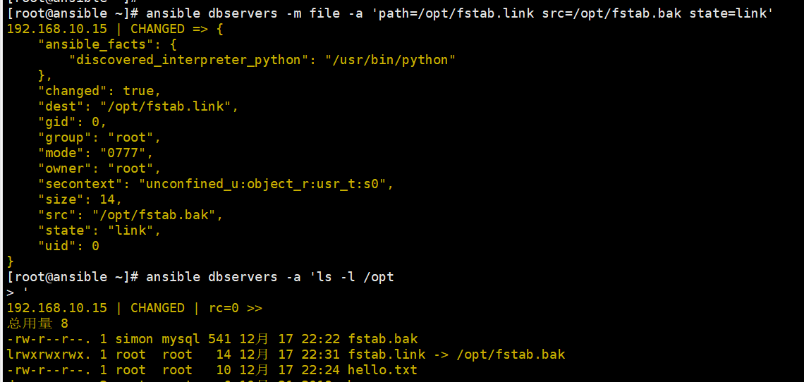 ansible dbservers -m file -a 'path=/opt/fstab.link src=/opt/fstab.bak state=link'