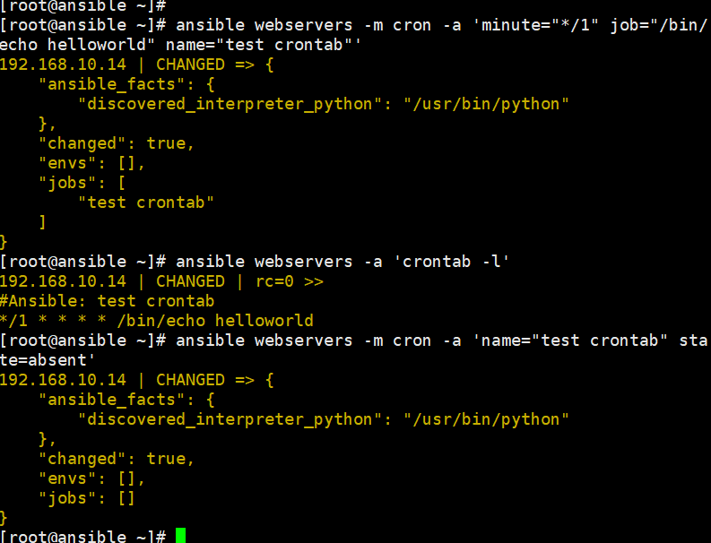 ansible webservers -m cron -a 'minute="*/1" job="/bin/echo helloworld" name="test crontab"'