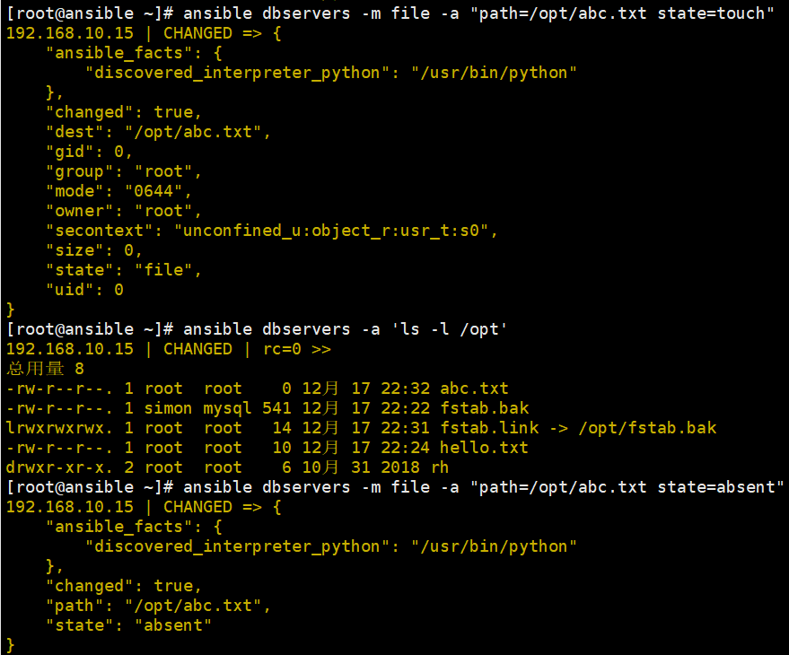 ansible dbservers -m file -a "path=/opt/abc.txt state=touch"