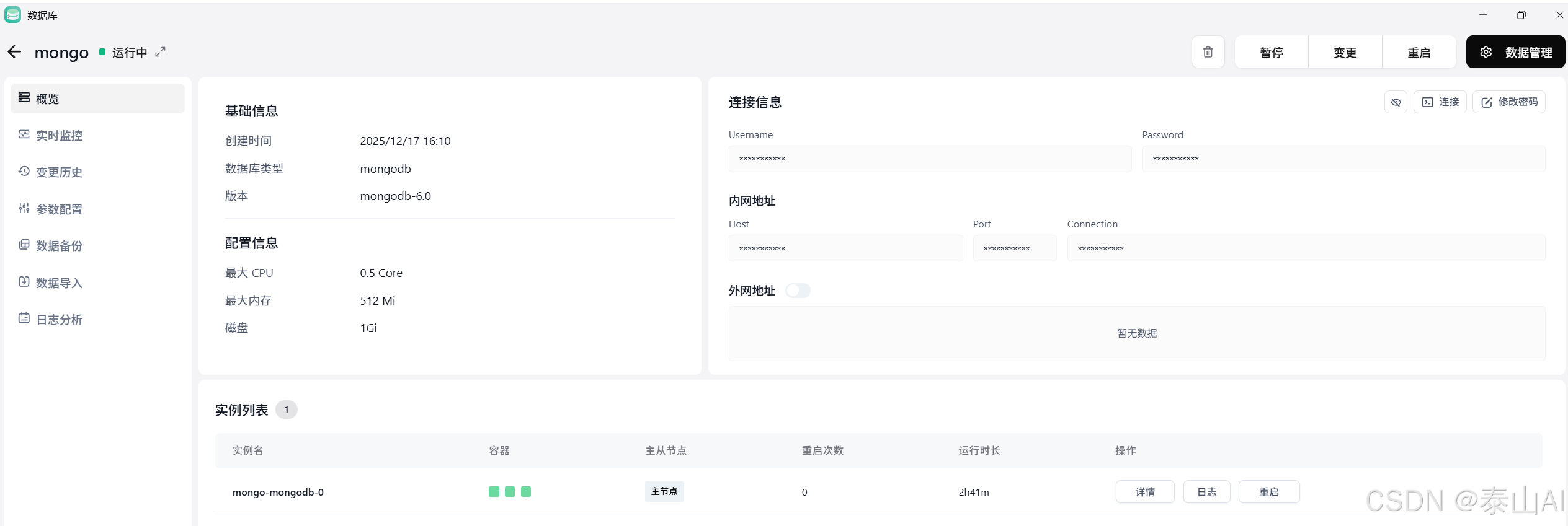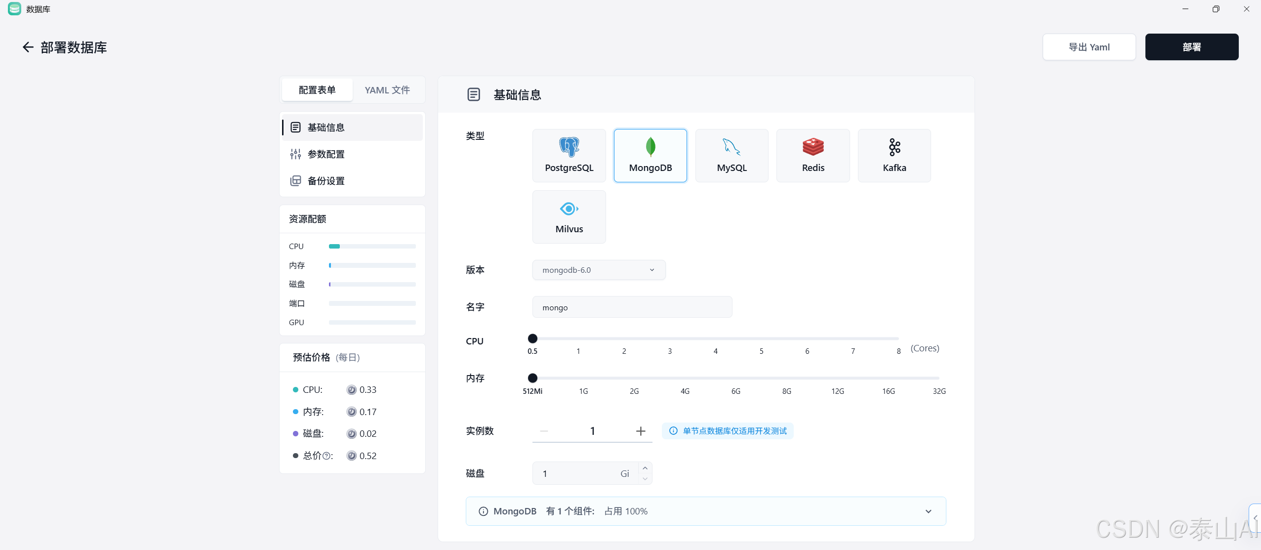 mongo✅ 同样需符合命名规范:仅含[a-z0-9-],且以小写字母开头 - 资源配置 :演示环境 → 全选最低配置
