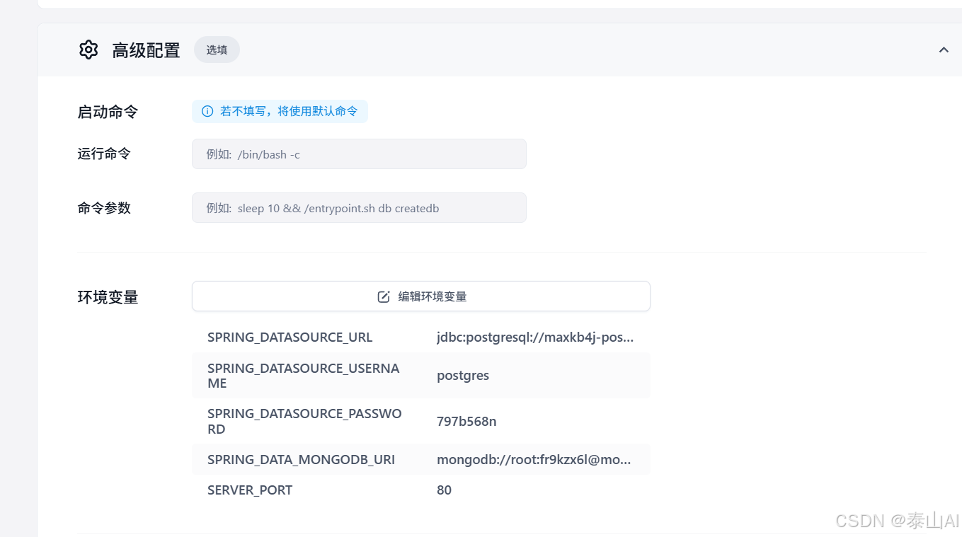 <POSTGRES_HOST>:PostgreSQL 的内网地址(如postgresql-postgresql.ns-xxxx.svc)<POSTGRES_PASSWORD>:PostgreSQL 部署时生成的密码<MONGO_HOST>:MongoDB 的内网地址(如mongo-mongodb.ns-xxxx.svc)<MONGO_PASSWORD>:MongoDB 部署时生成的密码