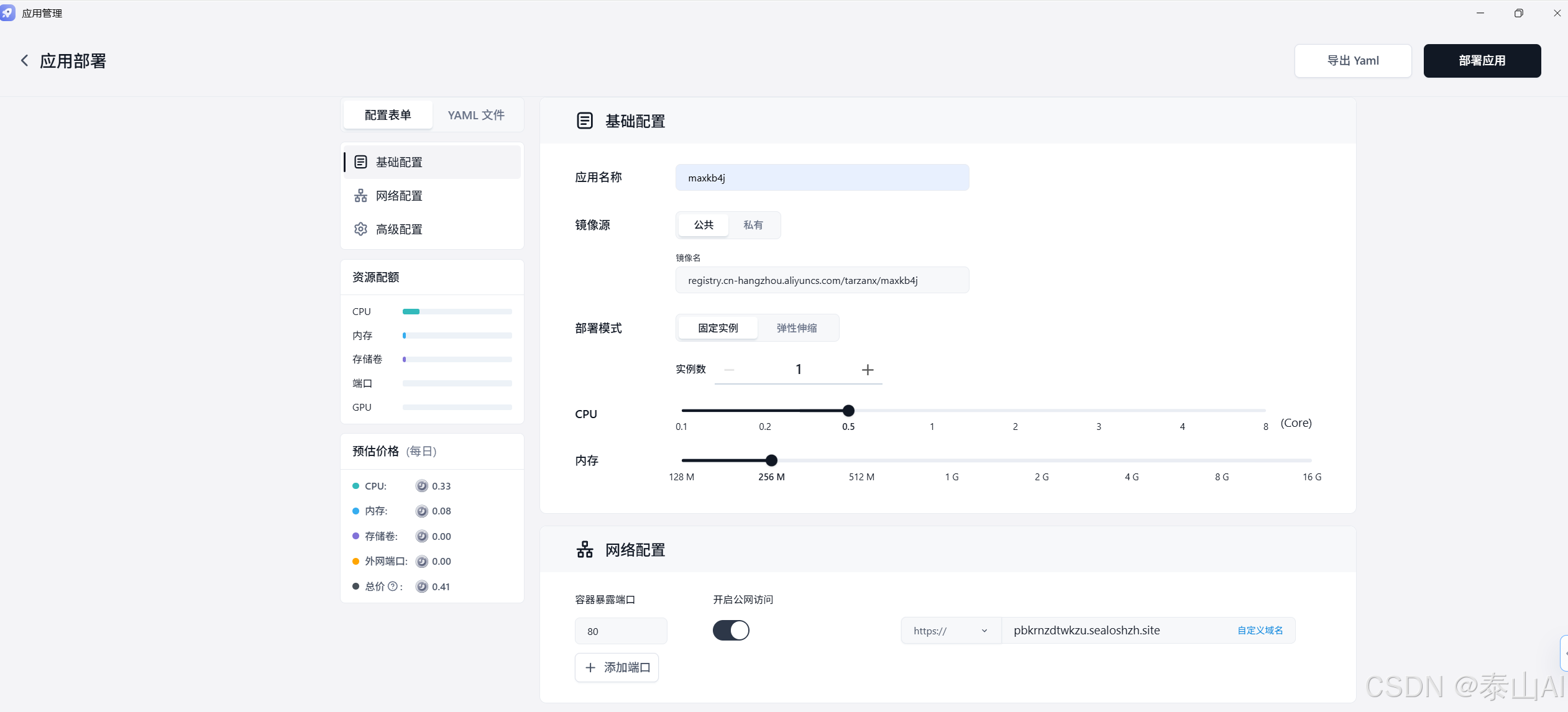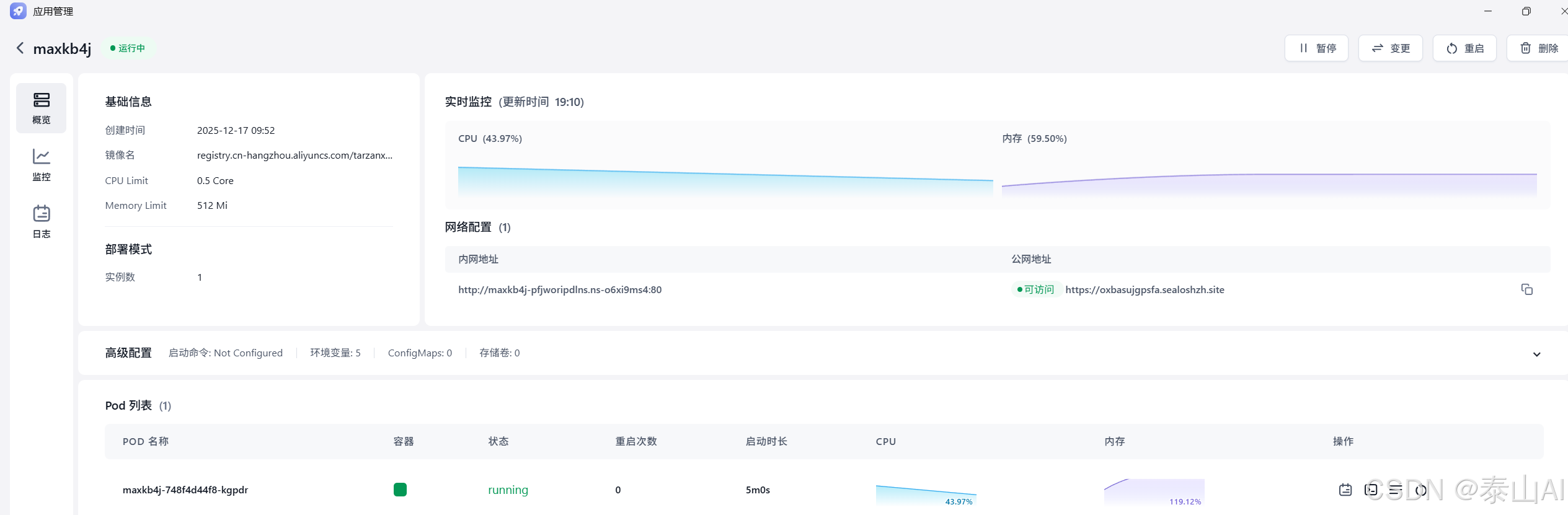 点击右上角 「部署」 按钮,等待应用状态变为 运行中。首次部署需拉取 Docker 镜像,可能需要几分钟时间。