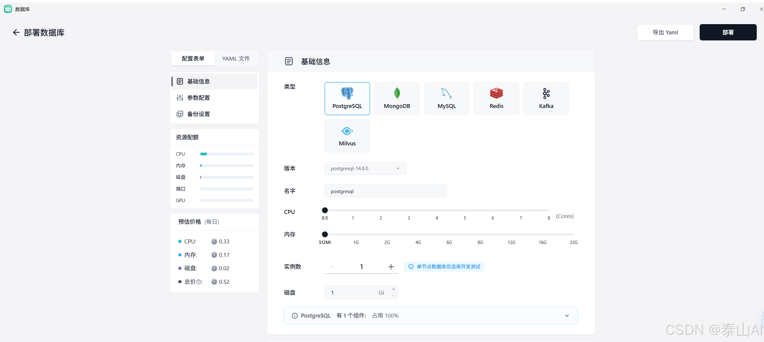 postgresql✅ 命名规则:仅支持小写字母、数字和连字符-,且必须以字母开头。 - 资源配置 :演示用途建议选择 最低配置