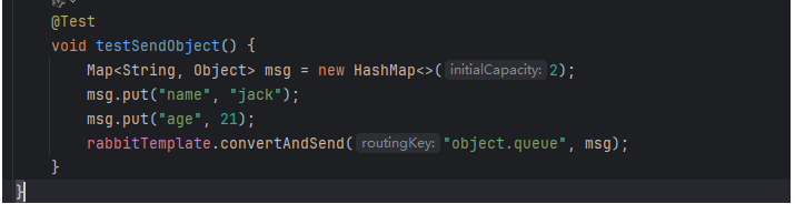 然后在publisher服务中编写测试类SpringAmqpTest,并利用RabbitTemplate实现消息发送: