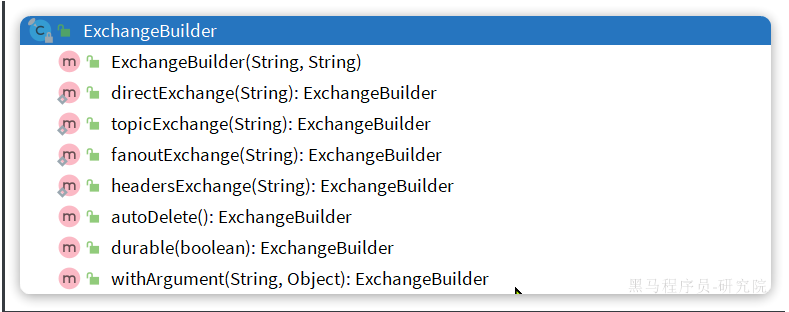 基于以上,我们可以自己创建队列和交换机,不过SpringAMQP还提供了ExchangeBuilder来简化这个过程: