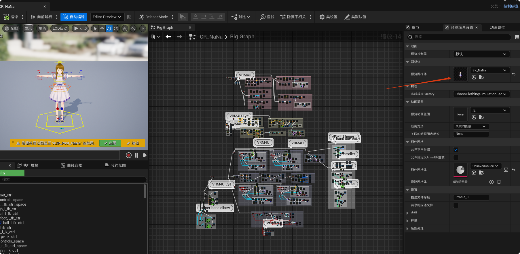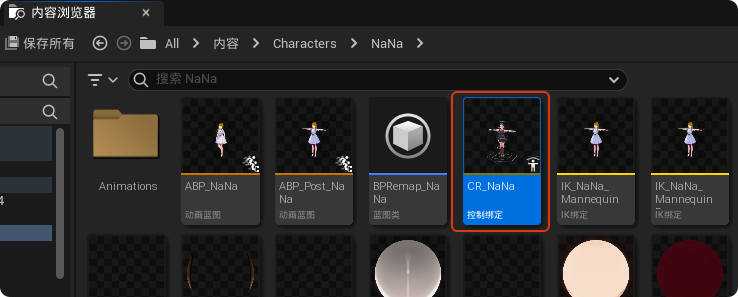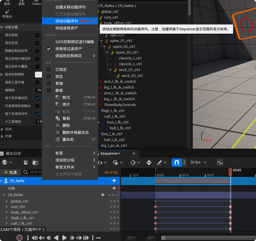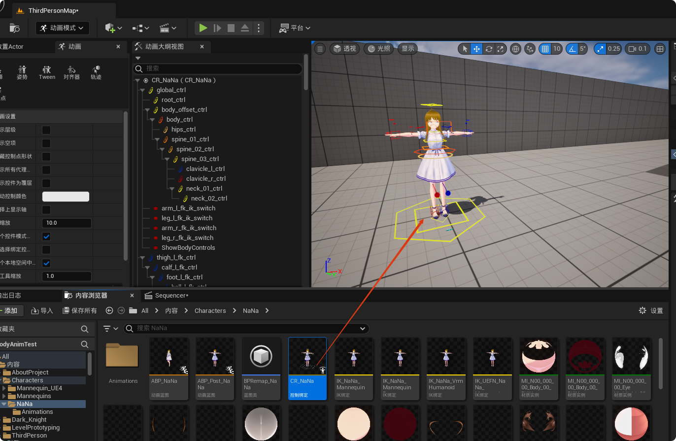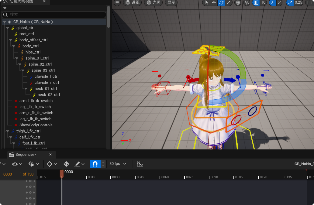 生成好后会覆盖之前的Contrl Rig"CR_NaNa"。将生成后的Contrl Rig拖入场景中,会自动进入动画模式并生成关卡序列