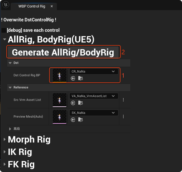 在打开的界面中先选择"Dst Control Rig BP",然后点击【Generate AllRig/BodyRig】