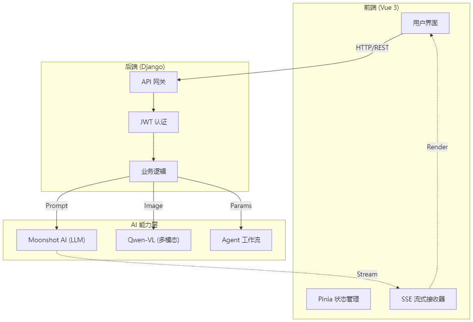 为了保证开发效率与系统的可扩展性,我采用了经典的前后端分离架构,并通过 API 网关集成外部 AI 服务。