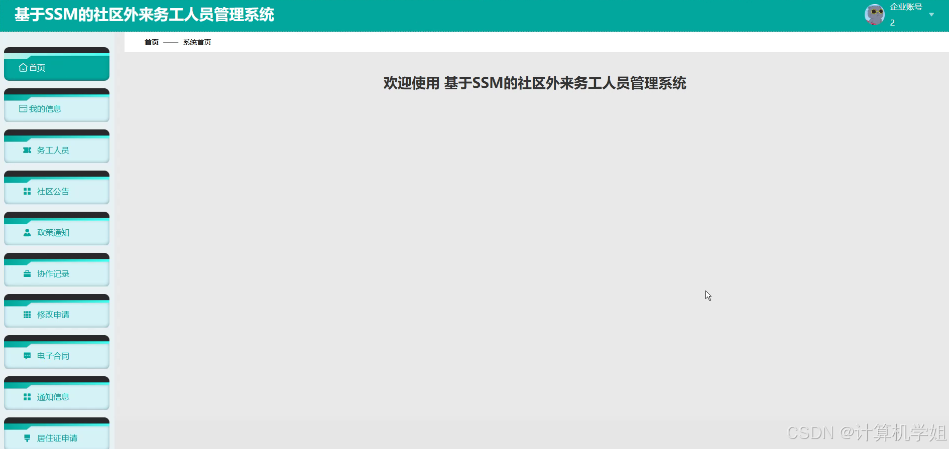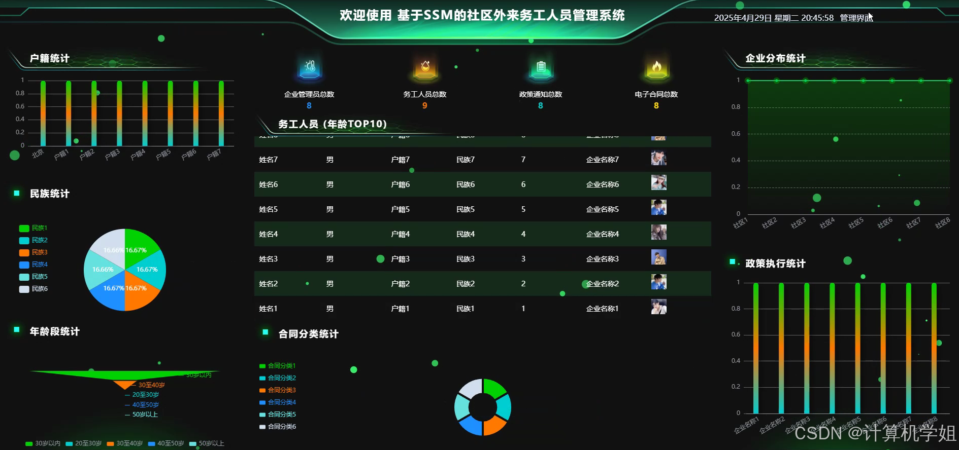 本研究旨在开发一套适用于社区场景的外来务工人员管理系统,通过整合信息技术与社区管理需求,解决传统模式中信息分散、流程低效、服务覆盖不足等痛点,提升社区治理的精细化与智能化水平。系统以务工人员为核心服务对象,围绕其基本信息管理、居住证办理、就业帮扶、权益保障等核心需求,构建一站式数字化服务平台,实现信息动态更新、业务在线办理、服务精准推送等功能。通过SSM框架搭建稳定后端架构,确保数据安全与业务逻辑的高效处理;利用VUE框架开发响应式前端界面,提升用户操作体验与系统可访问性;依托MySQL数据库实现数据的结构化存储与快速检索,支持多维度统计分析。系统设计兼顾社区工作人员与务工人员双重视角,既满足管理者对人员信息动态监控、政策落地跟踪的需求,又为务工人员提供便捷的在线服务渠道,减少其办事成本。最终目标是通过信息化手段优化社区资源配置,提升服务响应速度,增强务工人员对社区的认同感与参与度,促进社区和谐稳定发展,同时为类似场景的数字化管理系统开发提供技术参考与实践范例。