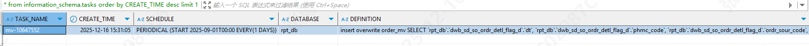 查看 tasks 表中的最新任务 select * from information_schema.tasks order by CREATE_TIME desc limit 1;