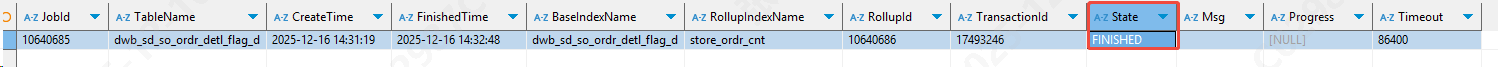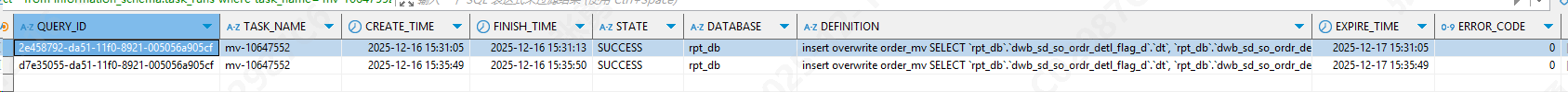 查看 在 task_runs 表中的执行状态 select * from information_schema.task_runs where task_name='mv-10647552' order by CREATE_TIME;