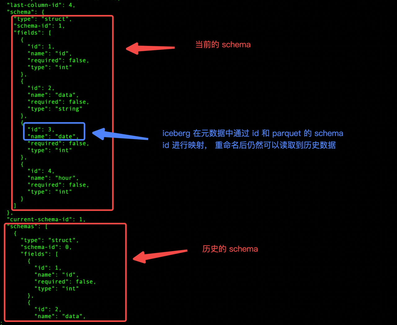 - Hive 不支持 rename 字段名, iceberg 支持 rename 字段名,并且重命名后不影响读取历史数据。