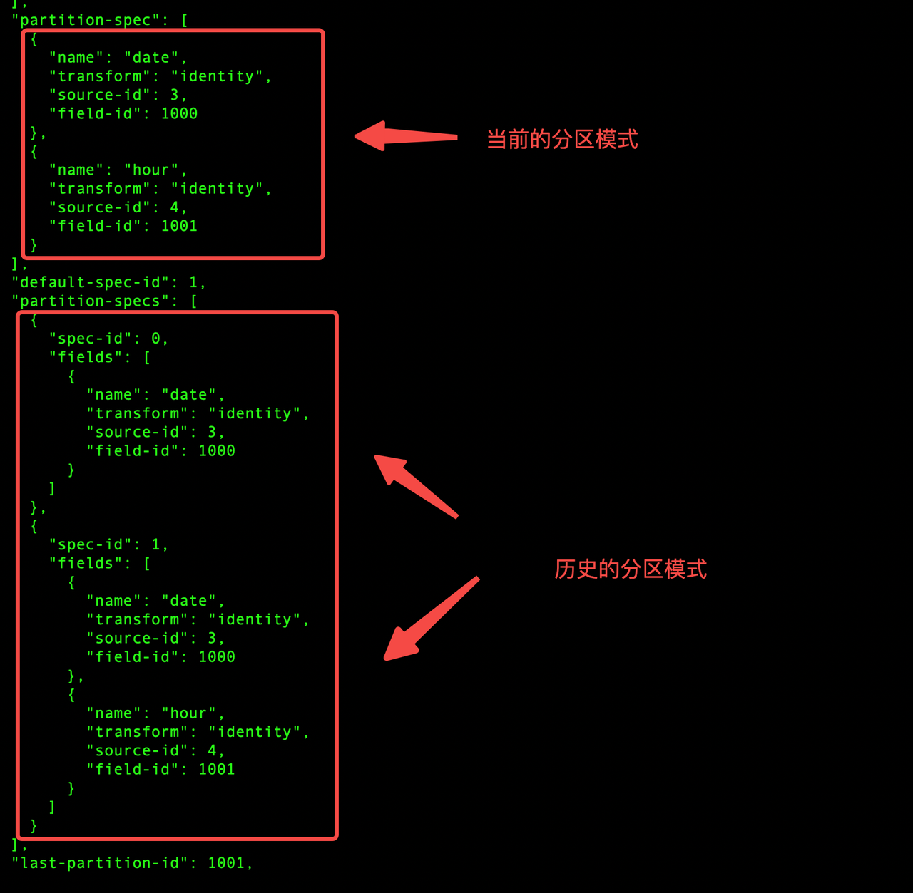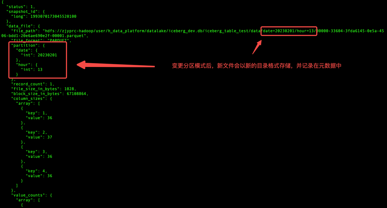 分区模式变更的原理是在元数据文件中维护了分区的不同模式,当分区模式发生变更后,新数据会以新的目录结构写入并被记录在元数据文件中,历史数据对应关系保持不变。