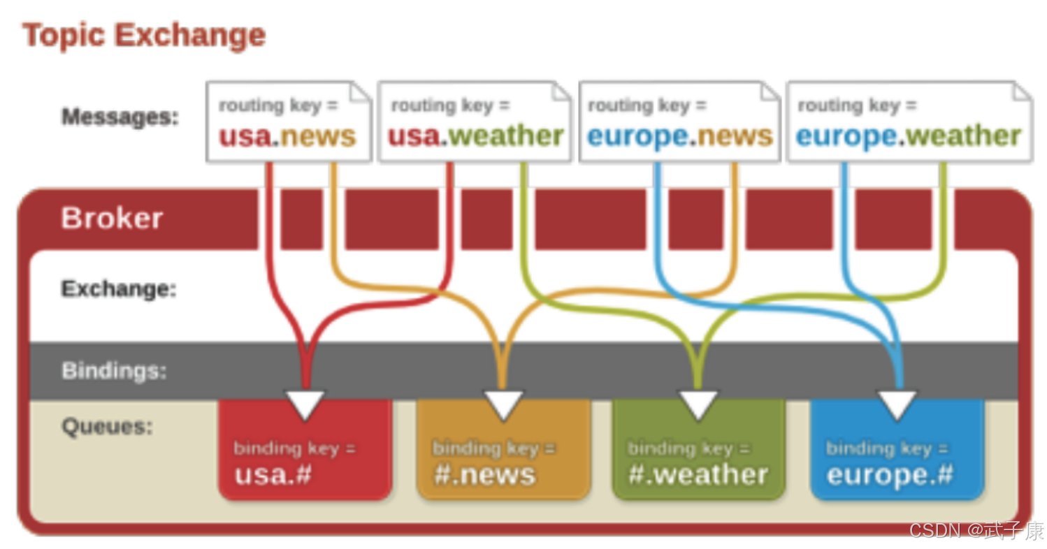 topic类型的交换器在 direct 匹配规则基础上进行了功能扩展,为消息路由提供了更灵活的匹配机制。以下是详细的匹配规则说明: