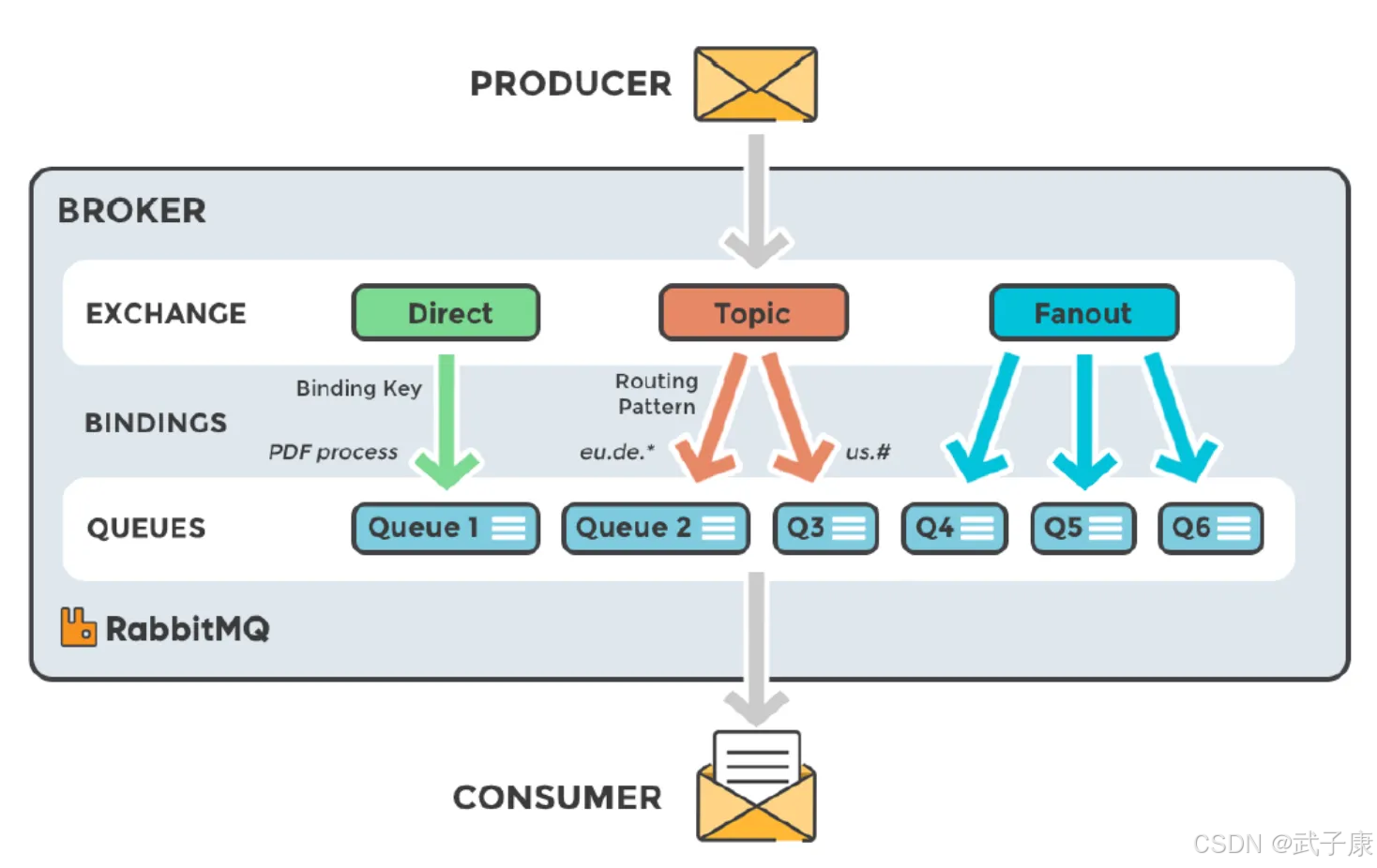- 场景:微服务解耦、异步削峰、广播通知,需要把消息"投递到对的队列"。