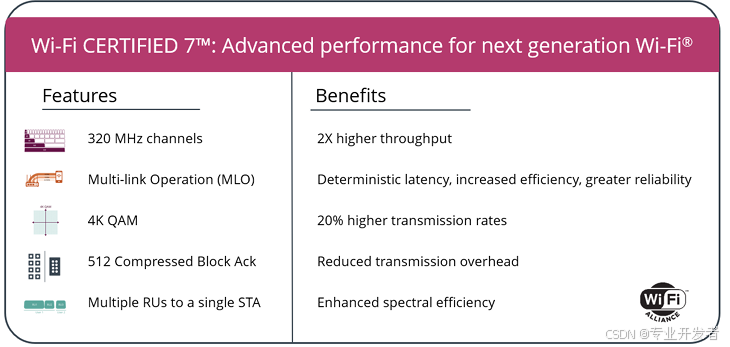 Wi-Fi CERTIFIED 7 即将推出的新功能将协同工作,可提供更高的数据吞吐量,同时还支持确定性延迟,可满足要求卓越可靠性的复杂用例。Wi-Fi CERTIFIED 7 的高级特性及功能包括: