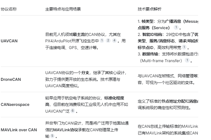 无人机上常用的高层协议都构建在基础CAN 2.0B标准之上(使用29位扩展标识符),主要有以下几种: