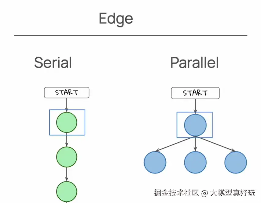 - 串行执行 :通过连续的普通边连接多个节点,形成一个线性的执行链。例如: