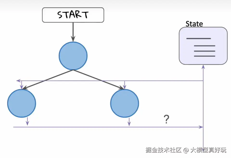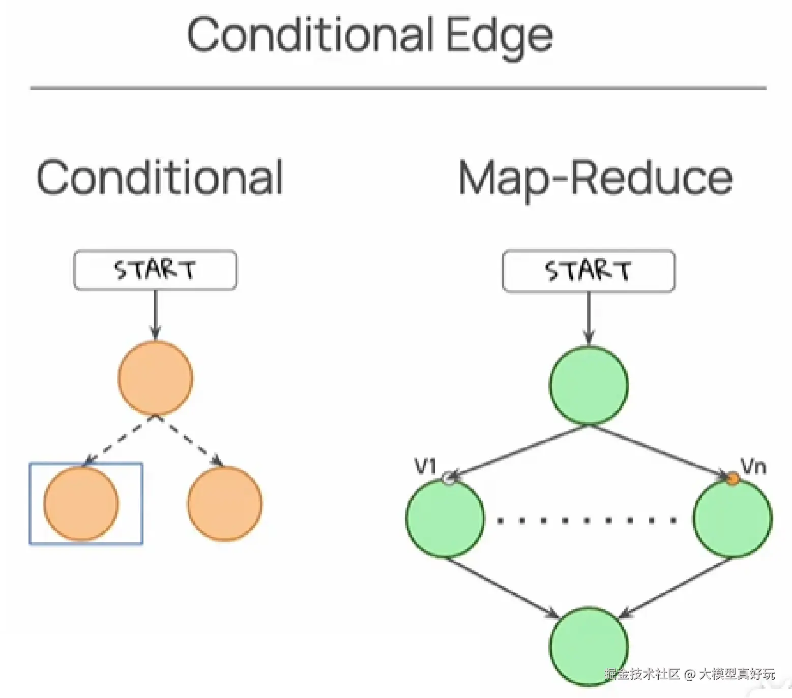 除普通边外,LangGraph还有另一种条件边。条件边允许工作流根据运行时状态动态决定 下一步的执行路径。它需要一个路由函数 ,该函数接收当前状态,并选择下一个要执行的节点。下图左侧根据条件选择将状态传递给下一级左侧节点进行处理。条件边还有一个特殊情况是MapReduce, 它可以创建可变数量的下游节点,并且每个节点都传递了一个唯一值(笔者之后也会讲到)。