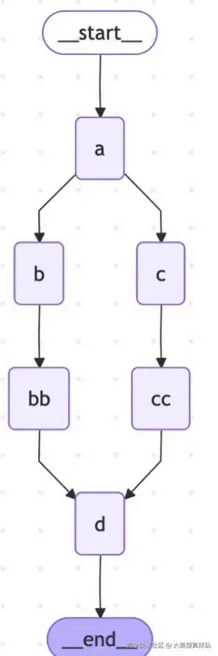 pythonbuilder = StateGraph(State) builder.add_node("a", node_a) builder.add_node("b", node_b) builder.add_node("c", node_c) builder.add_node("bb", node_bb) builder.add_node("cc", node_cc) builder.add_node("d", node_d) builder.add_edge(START, "a") builder.add_edge("a", "b") builder.add_edge("a", "c") builder.add_edge("b", "bb") builder.add_edge("c", "cc") builder.add_edge("bb", "d") builder.add_edge("cc", "d") builder.add_edge("d", END) graph = builder.compile() -