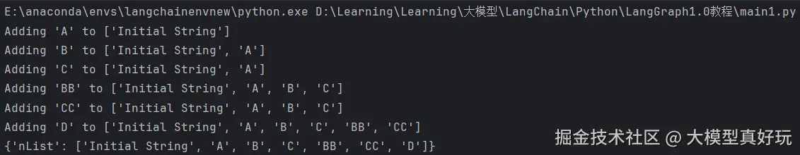 以上节点函数执行完成后会对字符串列表进行更新。State 可以被持久化(通过 Checkpointing 机制)。这意味着如果节点执行失败或工作流被中断,可以从上一个检查点恢复状态重新运行,保证了工作流的鲁棒性。