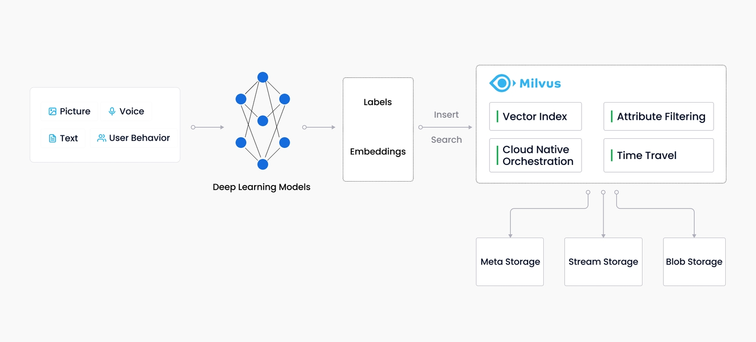 Milvus 于 2019 年创建,其目标只有一个:存储、索引和管理由深度神经网络和其他机器学习 (ML) 模型生成的大量嵌入向量。它具备高可用、高性能、易拓展的特点,用于海量向量数据的实时召回。