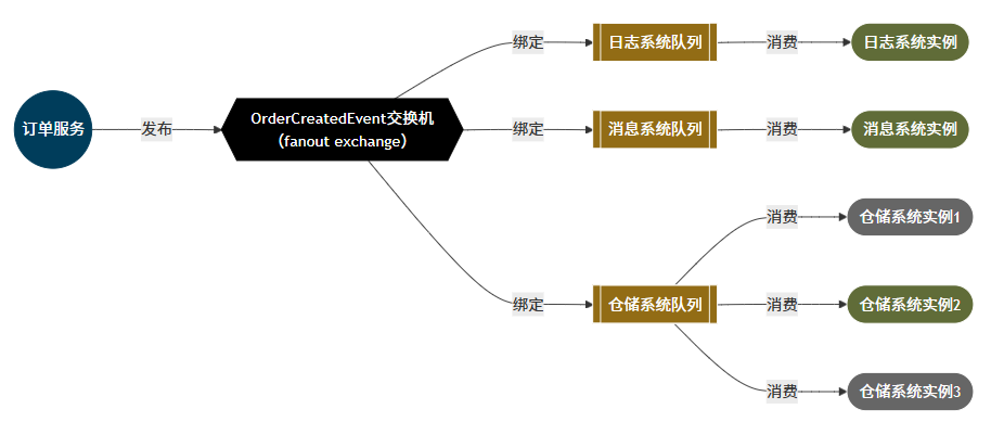 OrderCreatedEvent的订阅者单独建立一个queue,订阅者的所有实例都消费这一个queue的消息。 -