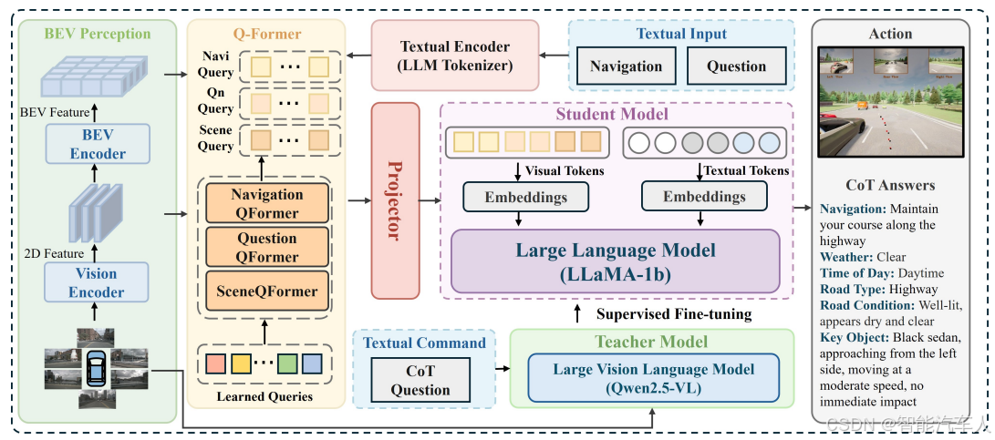 架构中包含两个主要组件:一个是在第(1)节中详细阐述的推理模型,另一个是在第(2)节中概述的端到端(E2E)驾驶模型。推理模型采用大型视觉语言模型(VLM),而驾驶模型则使用紧凑型大语言模型(LLM)。并且将知识蒸馏作为学习机制,使紧凑型驾驶模型能够从视觉语言模型(VLM)中习得推理能力。